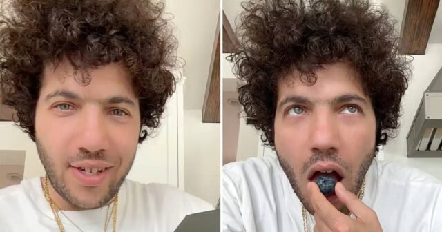 Blanko segura um mirtilo na câmera antes que Blanko trouxesse a boca e morda pela metade. “Ok, eu vou provar”, disse ele, “Oh, Deus. Isso é uma refeição”.