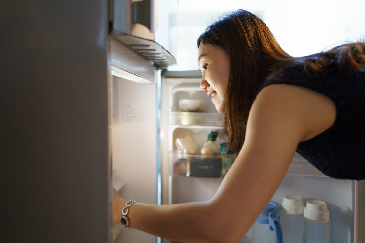 Uma mulher está assistindo na geladeira.