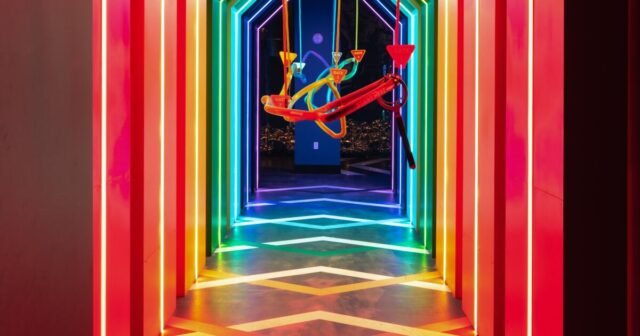 Isso pode ser dirigido por uma arte artificial da arte artística. O Omega Mart Center é que a contribuição de Meow Wolf no deserto, onde as flores estão em cima de nós, as paredes de rochas variam através das imagens e dos rios brilhantes abaixo de nós. Está quente, mas também uma mutação.