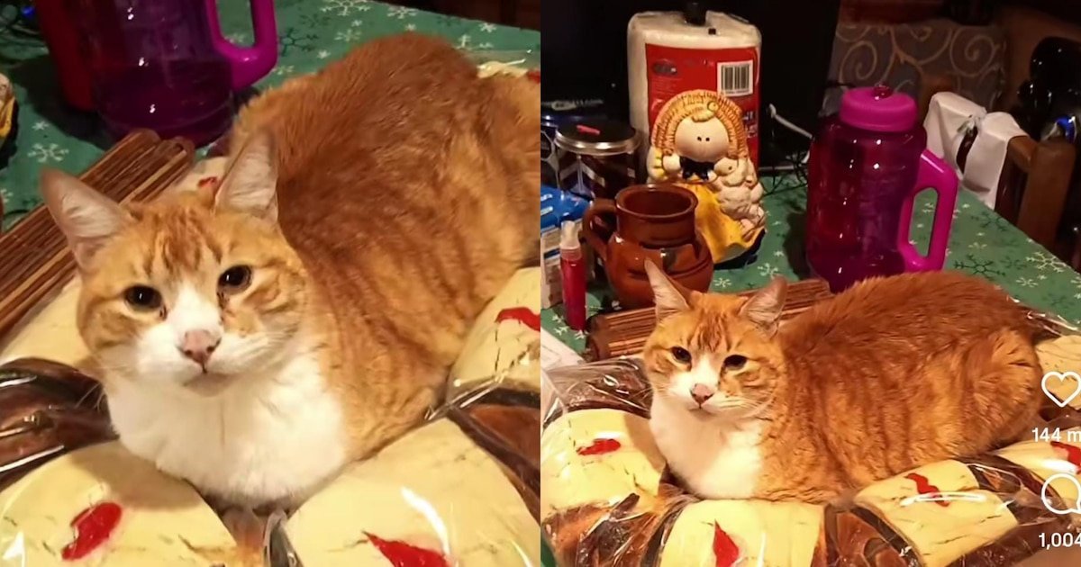 No vídeo, que já coletou mais de 144 mil comentários, é possível ver uma mesa com uma grande rosquinha oval e bem no centro, Totopo, um gato laranja, sentado calmamente como se visse o cama perfeito.