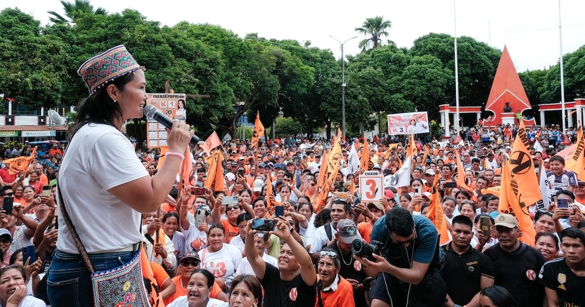 A candidata popular do Fuerza, Keiko Fujimori, dirige-se a uma multidão de apoiantes agitando bandeiras laranja num comício político, impulsionando a sua campanha antes das eleições gerais no Peru. (Difusão)