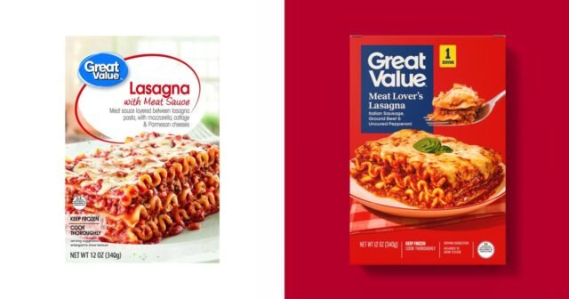 A atualização inclui imagens projetadas para tornar o produto dentro do produto mais atraente para o comprador. Por exemplo, a lasanha congelada Great Value contará com o macarrão guarnecido com folhas de manjericão, servido em um prato cheio e exposto sobre uma toalha de mesa vermelha com fundo vermelho, segundo a administração do Walmart. A caixa de hoje mostra a lasanha com molho branco.