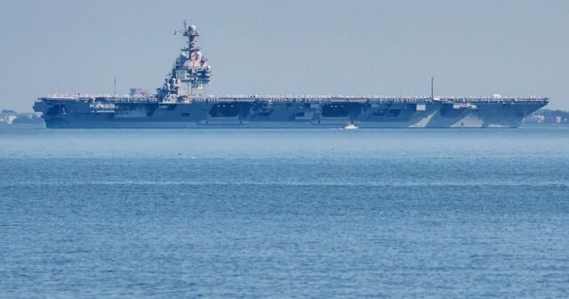 O grupo de porta-aviões Ford, que inclui esquadrões de caças e destróieres, forçou uma fila de barcos perto das Ilhas Virgens na manhã de domingo, disse a Marinha em comunicado.
