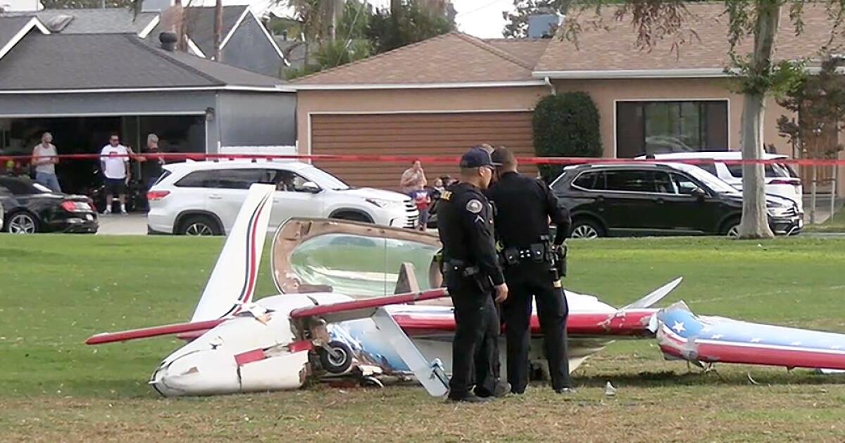 Um avião forçou uma corrida de emergência contra um parque em Long Beach, deixando o piloto e outra pessoa feridos na terça-feira depois de atingir uma mulher.