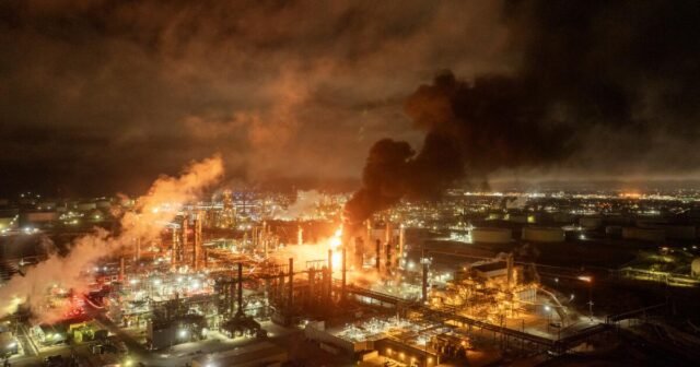 A explosão enviou ondas violentas ao longo do reparo, alegou ter atingido pelo menos um funcionário e perdeu a população da distância. Um pilar de 100 pés brilhava laranja brilhante para o céu noturno. E a fumaça e o cheiro nu e o cheiro ativo se moveram para o leste com os ventos.