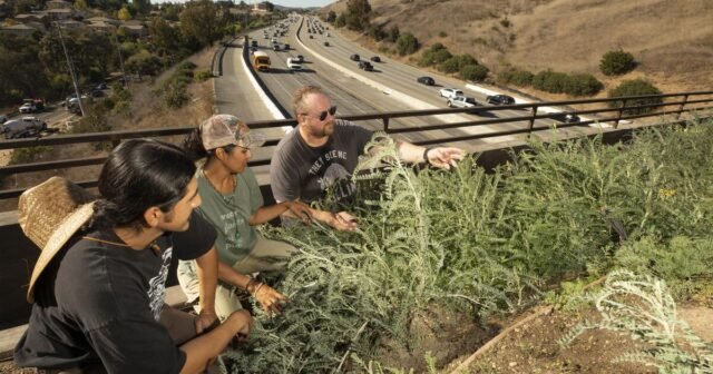No final do verão e início do outono, as plantas da Califórnia são marrons e abundantes, mas ainda estão vivas e em breve serão plantadas em cruzamentos selvagens, onde serão cuidadas e permitidas. Aqui, os gerentes de jardins de infância judeus Jose Samaniego e o curador de design de Jose Campos, Robert Rock, e o paisagista Makala Gibson