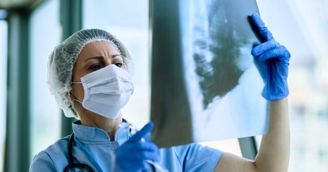 Um profissional de saúde examina uma radiografia de um paciente.