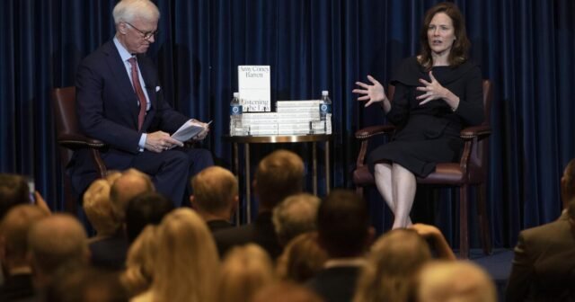 Barrett disse sobre a ascensão da justiça ou princípio de sua decisão durante o evento na terça -feira na terça -feira, Brett M. Kavanaugh, com café e cabeça de cafeteria.