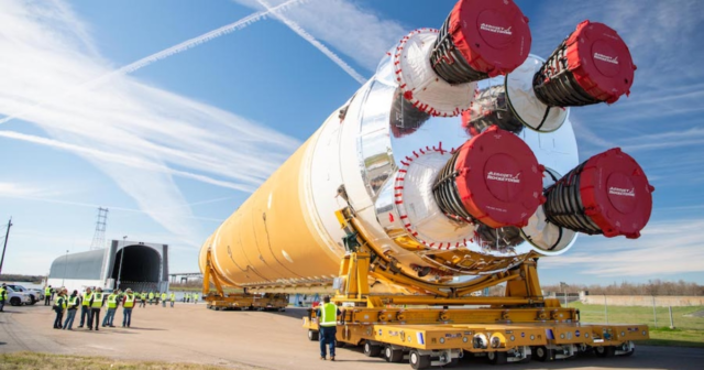 O sistema SLS inclui um estágio central de 64,6 metrostrazido por quatro motores RS-25 Alimentado por hidrogênio e oxigênio líquidos e dois propulsores laterais 54 metros de combustível cada. Estes números fazem do SLS um dos projetos mais ambiciosos já construídos para a exploração espacial.