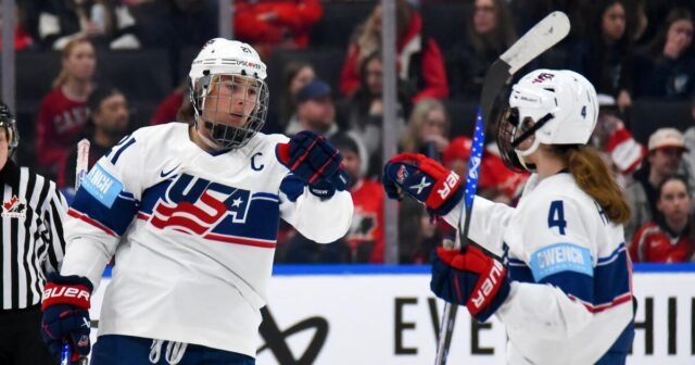 A jogadora americana Hilary Knight vai para o banco depois de marcar contra o Canadá em novembro de 2023.