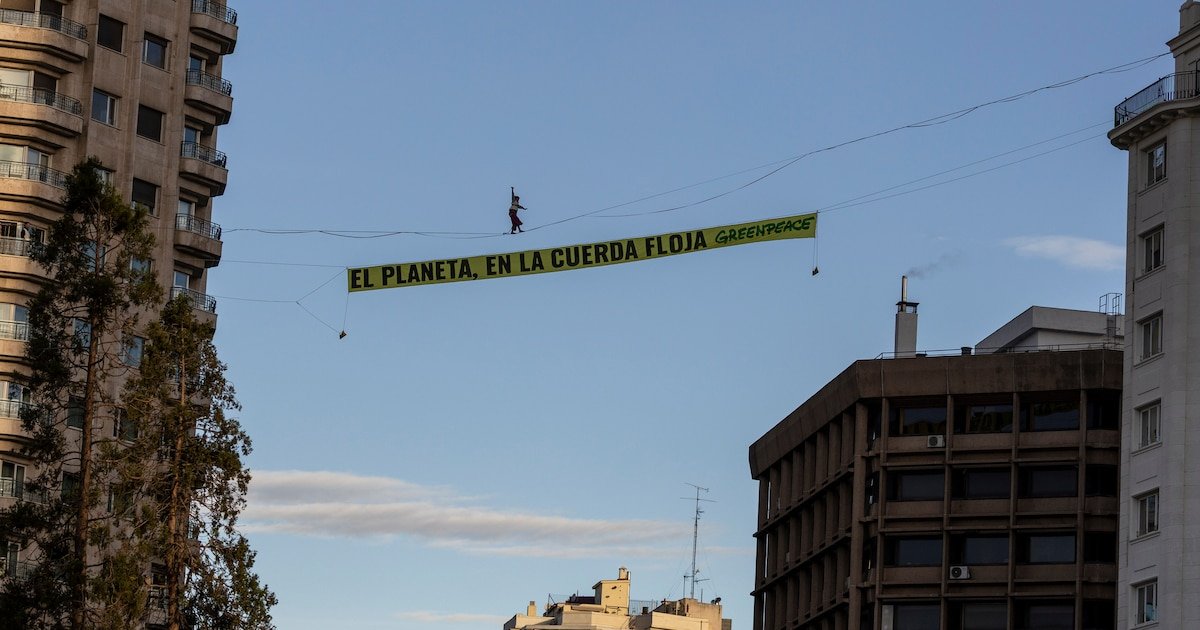 A 30 metros de altura, perto da Plaza de España, no coração de Madrid, ativistas verdes atravessaram a rua na segunda-feira para condenar a COP30, que começa dentro de algumas horas “O Planeta no Tiro”. Nesta ação inédita, pretende atender ao pedido da associação governamental à reunião do governo em Cop: que acabem com o petróleo e o fim da sua destruição antes de 2030.