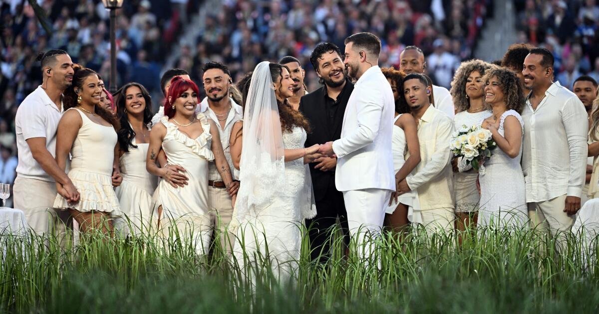 Para quem assistiu ao show de 15 minutos do intervalo de Bad Bunny, um casamento de verdade aconteceu no Levi’s Santa Clara Stadium, diante de 75.000 torcedores.