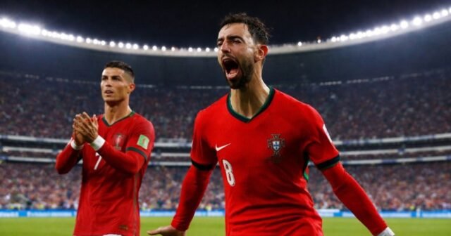 Futebol Futebol – Copa do Mundo – Eliminatórias UEFA – Grupo F – Armênia x Portugal – Estádio Republicano Vazgen Sargsyan, Yerevan, Armênia – 6 de setembro de 2025 Cristiano Ronaldo e Bruno Fernandes comemoram o terceiro gol em Yerevan