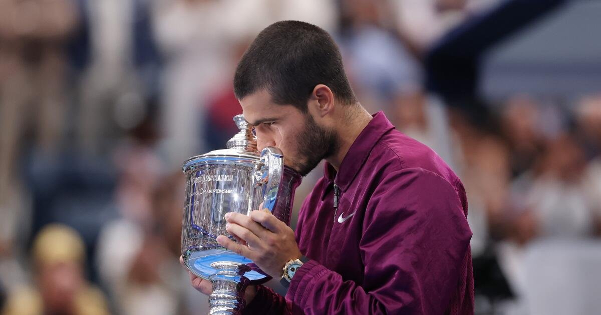 Celebrando Carlos Alcaraz, da Espanha, seguindo o pecador a Janik, da Itália, no último homem americano de York no domingo.