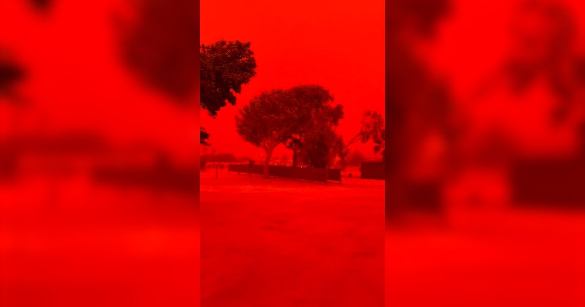 Os céus em partes da Austrália ficaram vermelhos com a passagem do ciclone Narelle, levantando poeira rica em óxido de ferro da terra seca. Essas partículas, combinadas com nuvens densas e umidade, dispersam a luz solar de tal forma o tom vermelho prevaleceu e o tempo mudou drasticamente, obliterando a visibilidade em minutos e dificultando a respiração.