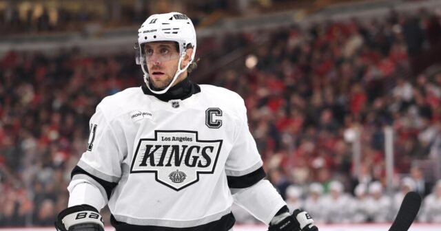 O capitão do rei Kopitar, à esquerda, conversando com o defensor Doughty durante o Jets Winnipeg em dezembro de 2023.