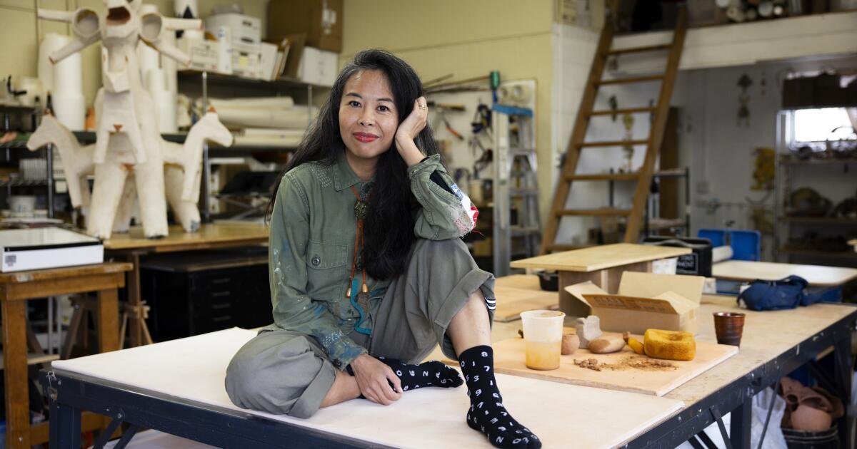 “‘Extravagância’ é uma palavra que apliquei ao meu trabalho. Não é a minha palavra”, disse ela durante uma recente visita ao estúdio em Monróvia que ela divide com o marido, um artista. Rob Satoe Associados em Cerâmica Marcos Rosie.