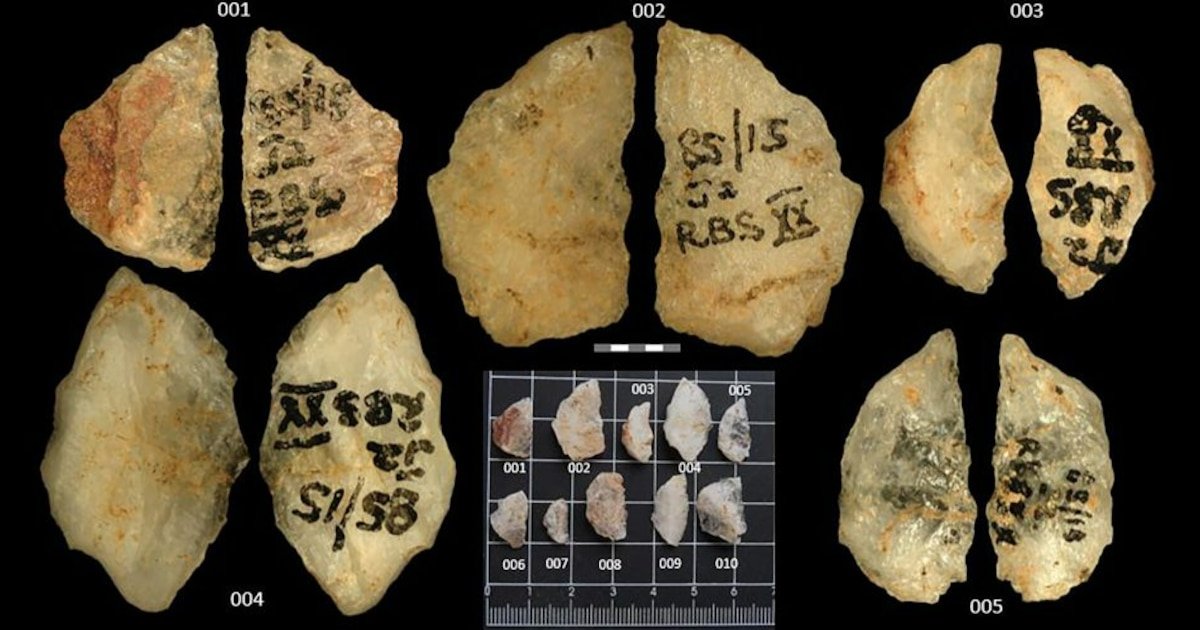 Uma ponta de flecha de quartzo encontrada no abrigo rochoso Umhlatuzana, na África do Sul. Sary Isaksson et al., Avanços da Ciência, 2026 (2)