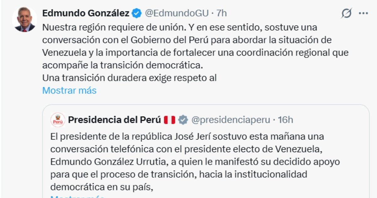 Através de sua conta oficial na rede social X, González agradeceu ao Peru o apoio que recebeu durante a conversa com o presidente interino. José Jeri. Ele confirmou em sua mensagem que o Situação venezuelana Desafios regionais que exigem coordenação política e diplomática a longo prazo.