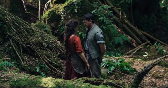 Os atores Paul Mescal e Jessie Buckley compartilham um momento íntimo no set de ‘Hamnet’, ambientado em uma selva densa (UIP)