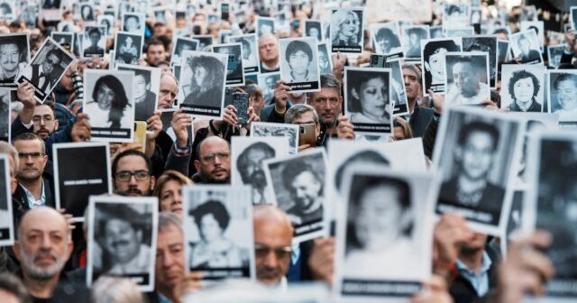 Manifestantes seguram fotos das vítimas do ataque à Associação Israelita Argentina (AMIA), em comemoração ao 30º aniversário do ataque (REUTERS).