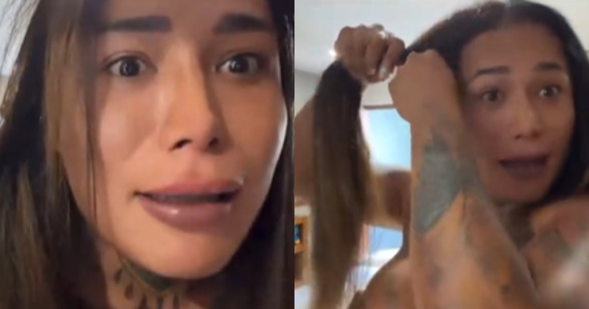 Durante uma transmissão ao vivo, Karina Torres alisa o cabelo, mas percebe um homem gritando com ela de sua propriedade.