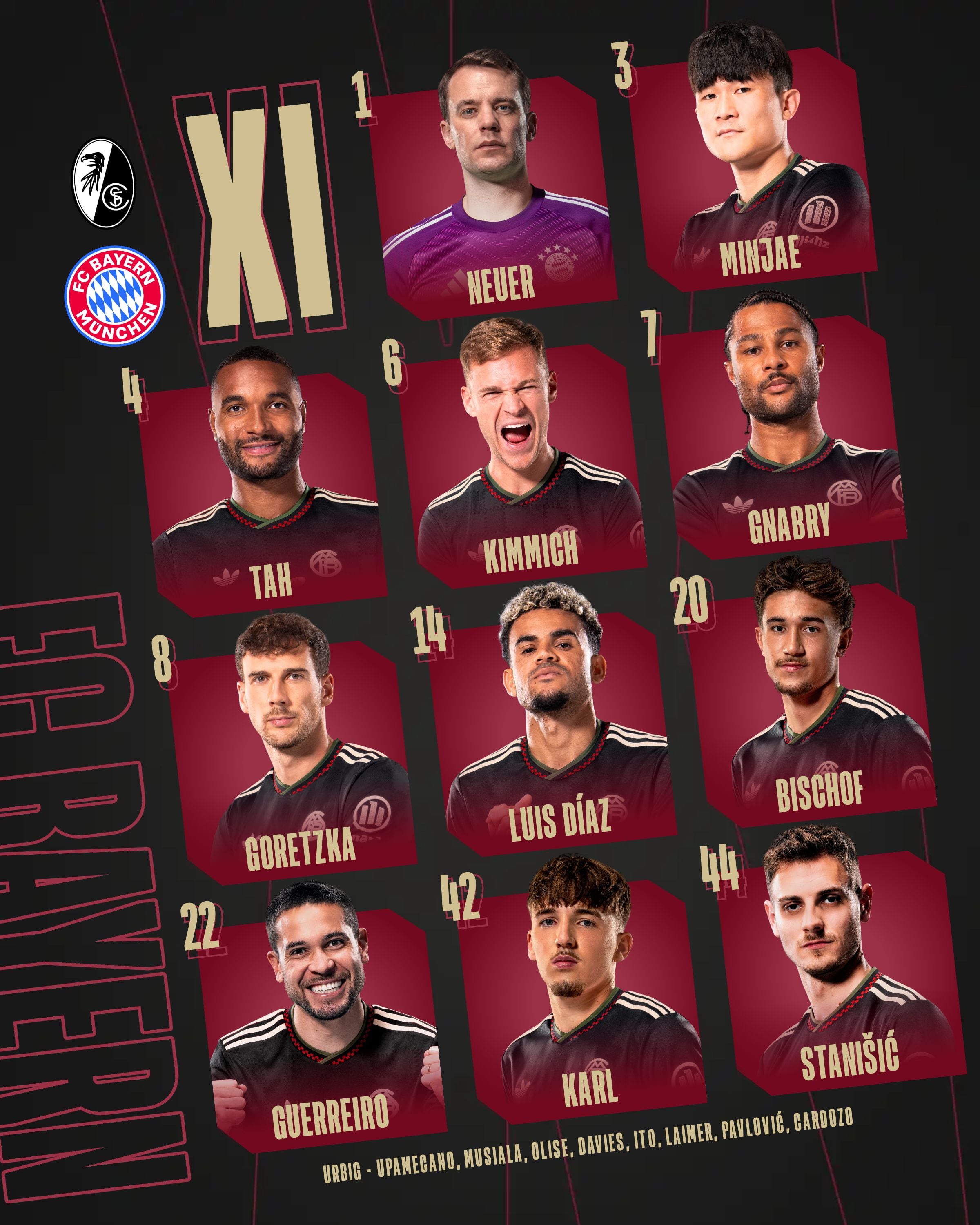• Substituir: Dayot Upamecano, Konrad Laimer, Michael Olise, Jamal Musiala, Aleksandar Pavlović, Jonas Urbig, Hiroki Itō, Alphonso Davies, Maycon Cardozo