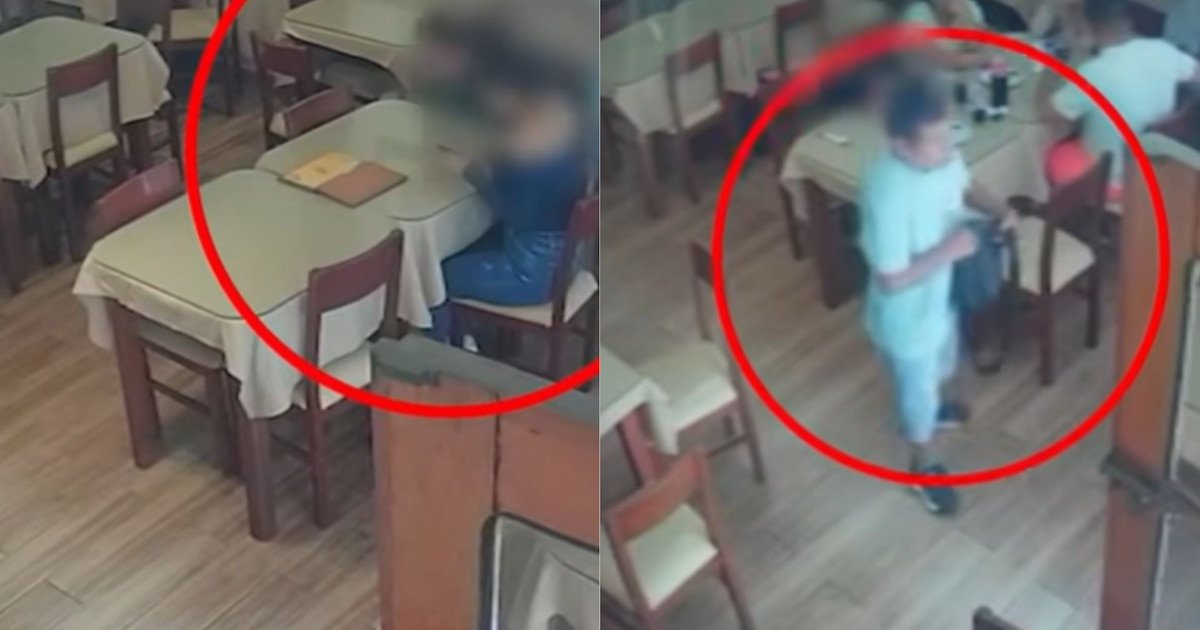 Pouco tempo depois, uma família sentou-se naquela mesa. Câmeras de segurança do restaurante capturaram o momento em que uma mulher foi vista com sua família, encontrou a bolsa.