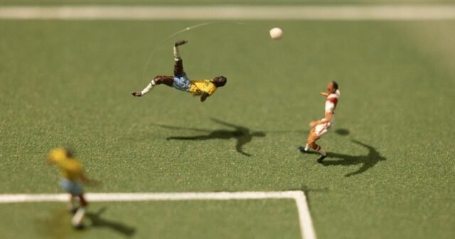 Barrois e a curadora do LACMA, Britt Salvesen, reuniram 60 obras, incluindo 40 vinhetas da Copa do Mundo e quatro curtas-metragens, incluindo o filme “Balé de futebol”que recria 21 cenas famosas em um campo de futebol de 50 polegadas.