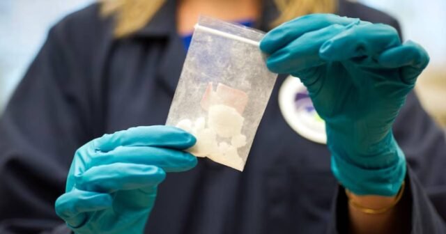 Um homem com luvas azuis segura um saco plástico transparente contendo pequenas quantidades de fentanil branco, destacando os perigos desta droga ilegal em meio à epidemia de opioides.
