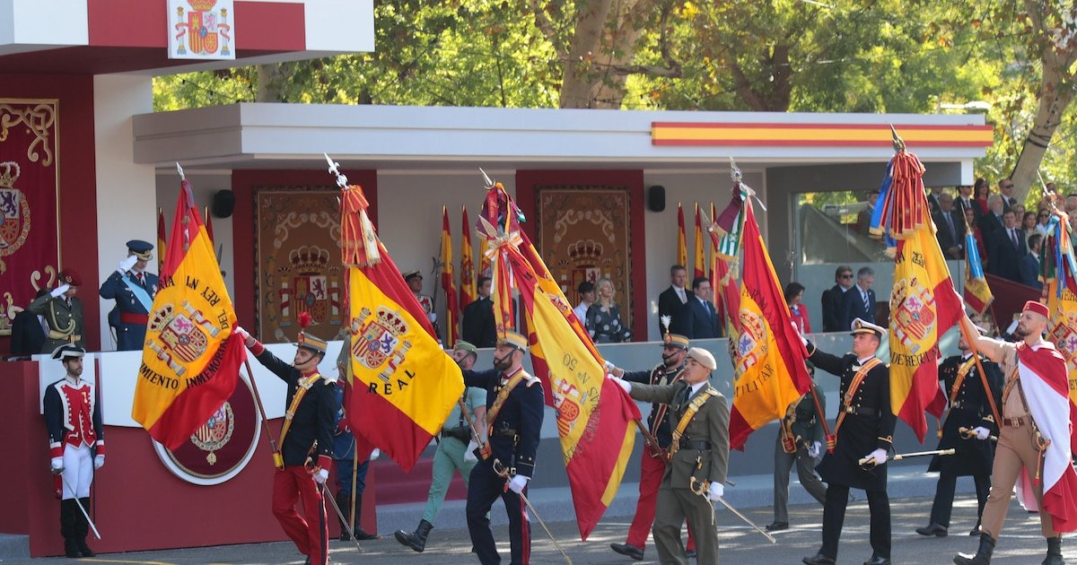 A maldade começa com a chegada de Rei da tribuna Às 11h00, recepção dos respectivos militares e saudação tradicional das autoridades. Um dos momentos emblemáticos é o Pule de paraquedas Na frente do rei Tribune. O Primeiro Sargento Óscar Marsal Hernández estará no comando do regime Bandeira da Espanha, que tem 24 pés quadrados e pesa 15 libras. O Sargento Sargento José Carlos González Herrera é sócio próximo a ele.