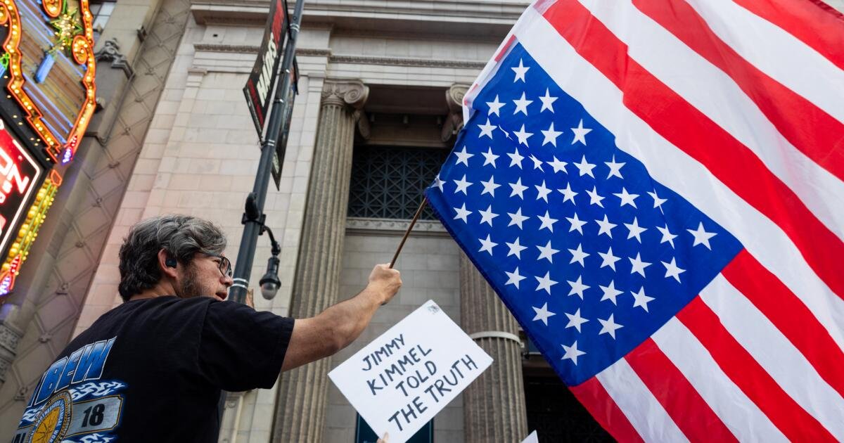 Kyle Engberg, uma piada, levou todas as estradas de San Diego para ser um dos primeiros dos protestos. “Tudo o que (Kimmel) é muito afetado, em comparação com o que você encontra na Fox, para derramar Spuber”, diz Engberg. “É uma pena o que acontece com a democracia neste país”.