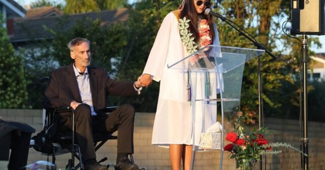 Abbi Kerwin, uma estudante de 18 anos do último ano da Huntington Beach High School, recebeu seu diploma de seu pai durante uma cerimônia emocionante com a presença de centenas de pessoas no Bolsa View Park.