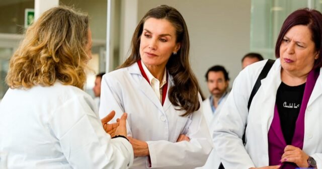Um dos momentos mais emocionantes do dia foi quando o rei chegou vestindo um jaleco para acessar um dos sites de pesquisa. Uma foto inusitada que permitiu que Letizia fosse vista em um contexto mais científico do que sua programação habitual.