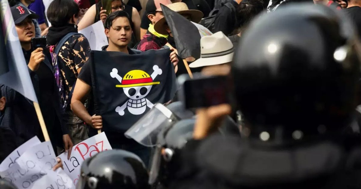 A bandeira da geração Z tremulou no centro de Mérida, onde vários concorrentes se reuniram para exibir slogans como “Ele o matou, em oposição ao que descreveram como o” Narcogoverno de Claudia Sheinbaum “e a morte de Carlos Mango”.