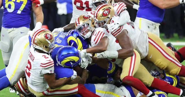 O San Francisco 49ers 49ers defendeu os gêmeos Alfred (95) para comemorar seus colegas depois de pressionar o Ram a retornar a Kyren Williams a cair na última quinta -feira.