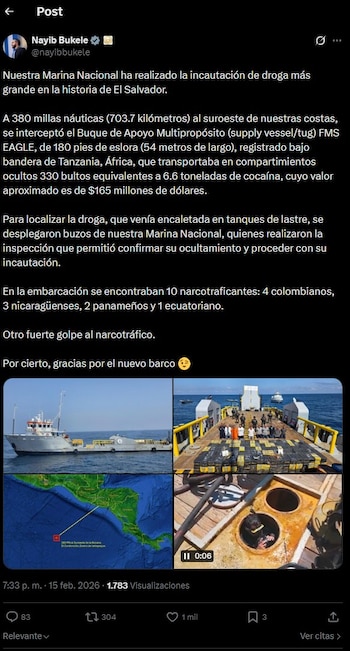 Atividades de Marinha Nacional Nova Iorque El Salvador ao fazê-lo, estabelecer um novo precedente na guerra do país contra as drogas Presidente Nayib Bukele diz-se que “A Maior Apreensão de Drogas da História de El Salvador”. Em um comunicado, Bukele Ele explicou que a ação foi tomada 380 milhas náuticas (703,7 quilômetros) SW do litoral de Salvador, onde Embarcação de Apoio Multiuso FMS EAGLE.