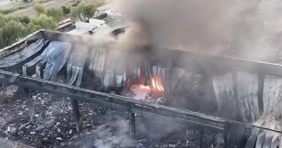 Uma vista aérea mostra fumaça espessa e chamas queimando novamente em uma fábrica atingida em Francisco Álvarez