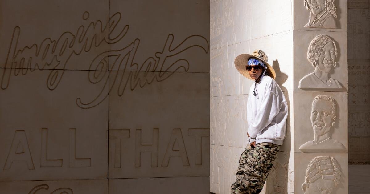 O parque da ‘irmã sonhadora’ de Lauren Halsey, no sul de Los Angeles, apresenta esfinges e esculturas, juntamente com uma coluna hatórica em estilo egípcio apresentando os rostos do mentor e da família de Halsey.
