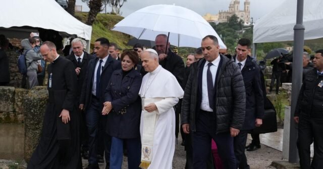 O papa chegou às ruínas em meio a fortes chuvas e forte segurança, com atiradores de elite cercando o local e policiais estacionados a poucos metros de distância nas estradas que levavam a ele.