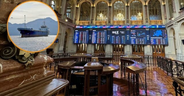 O quadro informativo da Bolsa de Madrid e um navio no Estreito de Ormuz (montagem Infobae com imagens da Europa Press e Reuters)