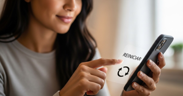 Logo atrás está uma mão segurando um smartphone preto com uma tela 'Reiniciando...' e um ícone de carregamento. Ao fundo, um laptop escuro, uma xícara e um livro.