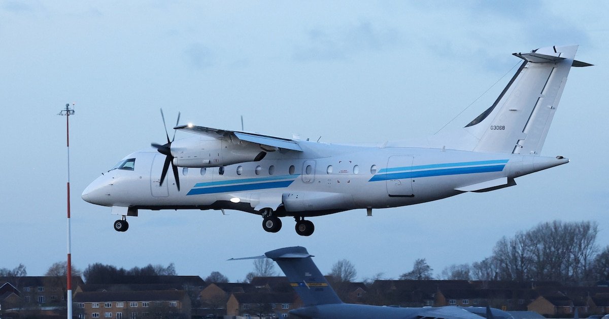 Uma aeronave se aproxima para pousar na base aérea RAF Fairford, Grã-Bretanha, 7 de janeiro de 2026 (REUTERS/Toby Melville) #