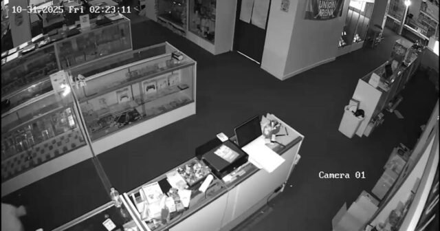 Em vídeo postado pela loja no Instagram, cinco suspeitos encapuzados vão direto ao expositor de cartões, quebram o vidro e pegam os cartões. Esta é a segunda vez que a loja é atingida em menos de um ano, disse Morton.
