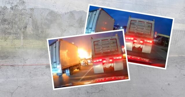 A filmagem, captada por um dispositivo dentro de um dos carros, mostra o momento exato em que um trator-reboque se aproximou em alta velocidade e bateu em uma fila de carros estacionados, causando uma explosão imediata.