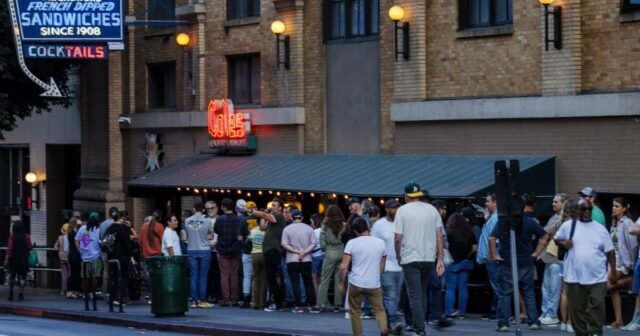 Uma vista do centro do Cole’s French Dip, com moradores fazendo fila do lado de fora do restaurante histórico esperando uma hora ou mais para se sentar.