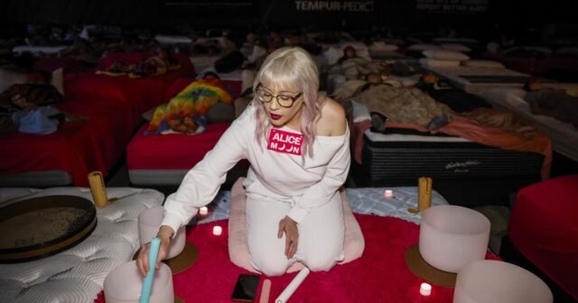 No evento, Raccio – que facilitou chuveiros para empresas como Chanel, BMW e Parker Hotel – serve chá, toca instrumentos (incluindo uma tigela de quartzo tradicional) e é o centro das atenções entre as camas Hästens de última geração, incluindo o colchão Grand Vividus de US$ 720 mil, apelidado de “o colchão mais caro do mundo”.