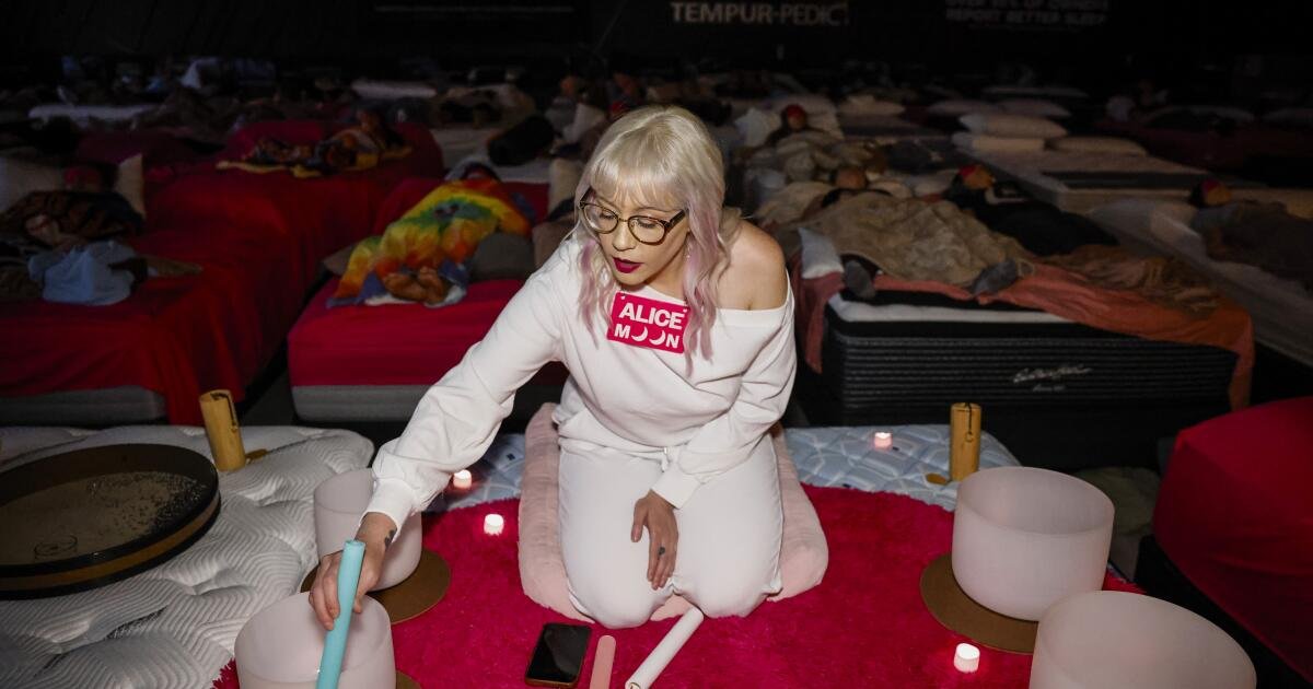 Eu me movo no escuro. O mesmo vale para outros. Somos cerca de 30, talvez mais – todos vivendo o som das tigelas de quartzo; horas livres de tecnologia projetadas para nos conectar à memória, criatividade e emoção. A trilha sonora encerra oficialmente o banho de som, convidando-nos a nos familiarizarmos com a presença física, a “acordar” oficialmente. Saia dos cobertores e do colchão alto e inchado, depois agradeça, pegue um cristal, um cartão de mantra… e saia do gigantesco depósito de colchões para as luzes brilhantes do Glendale Boulevard.