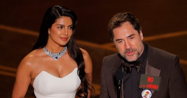 Javier Bardem (com placa de ‘Não à Guerra’) e Priyanka Chopra Jonas no palco do 98º Oscar em Hollywood. REUTERS/Mike Blake