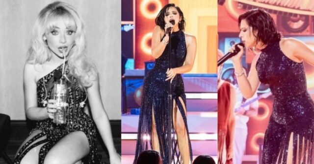O vestido de Carpenter é preto, transparente, recortado e com strass prateados, e faz parte de um show especial oferecido por Sheryl Crow aos telespectadores do país. (Captura de tela @angela_aguilar_ / @sabrinacarpenter)